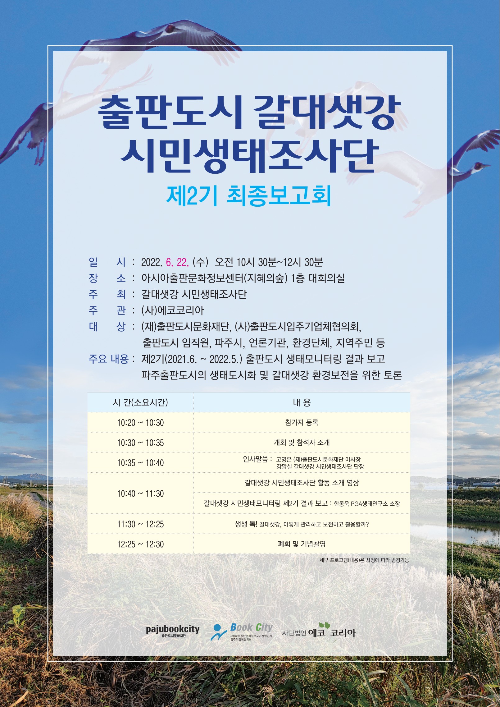 파주출판도시의 생태도시화를 위한 '출판도시 갈대샛강 시민생태모니터링' 제2기 최종보고회를 아래와 같이 진행합니다.