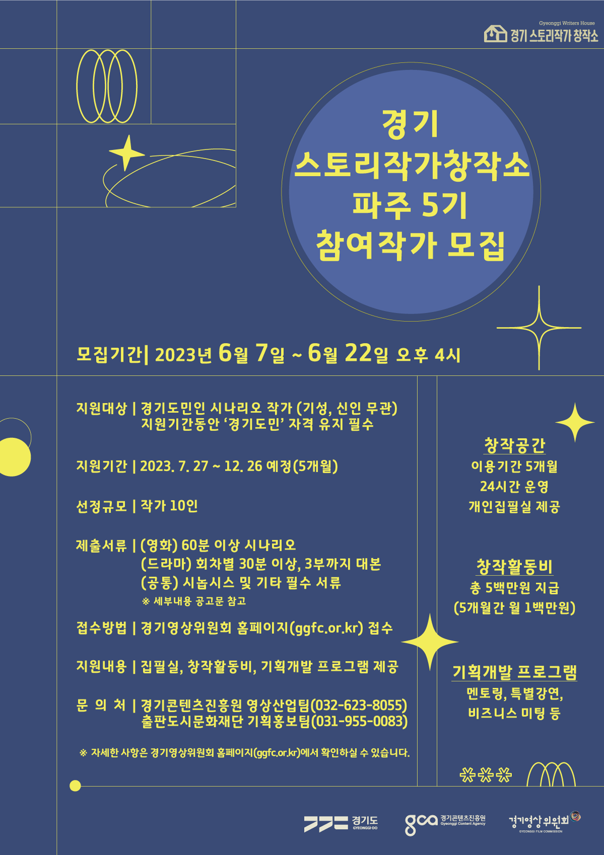 - 지원대상 : 경기도민인 시나리오⋅시리즈(대본) 작가(기성, 신인 무관)