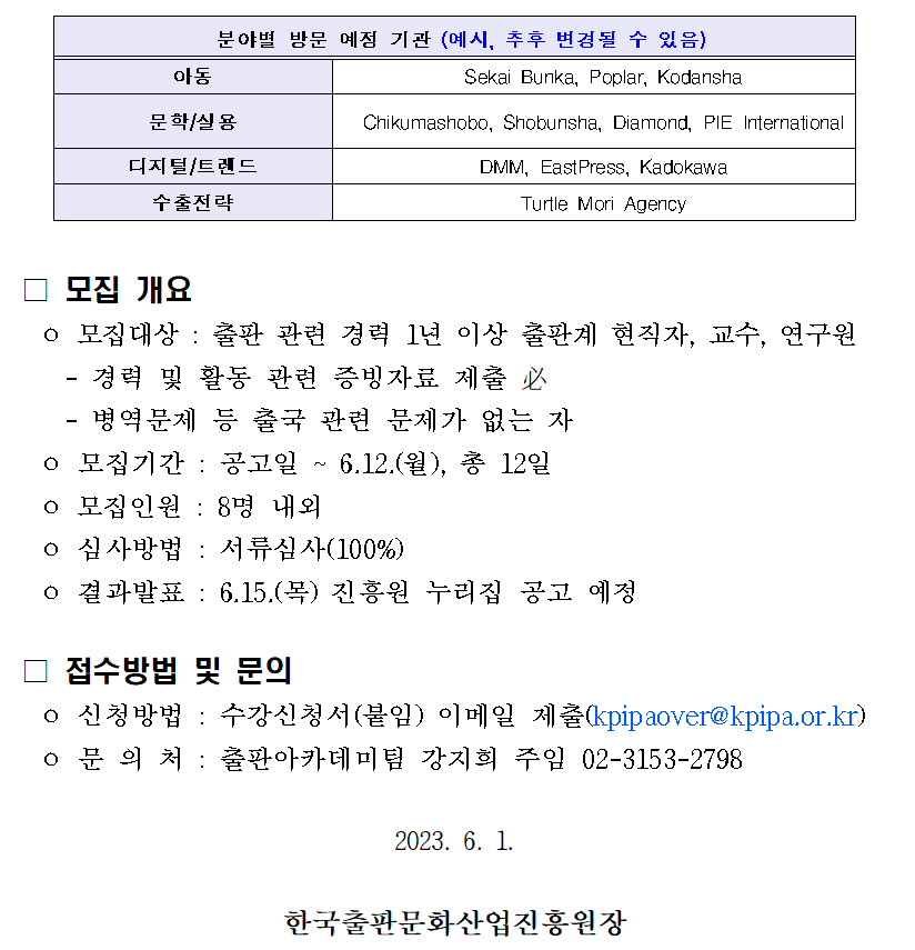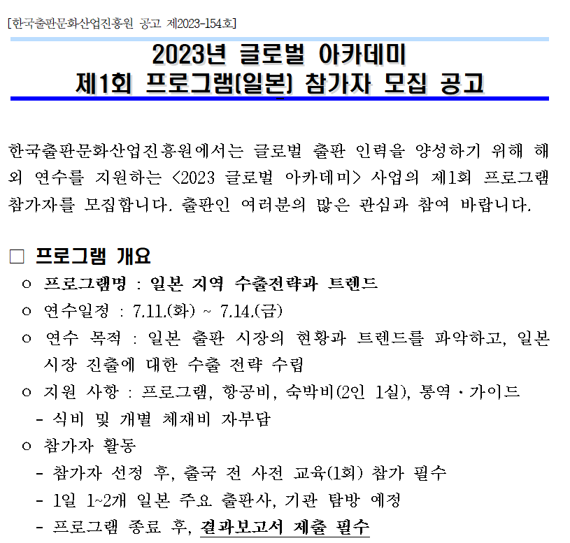 아래와 같이 한국출판문화산업진흥원에서 2023년 글로벌 아카데미 제1회 프로그램(일본) 참가자를 모집합니다.
