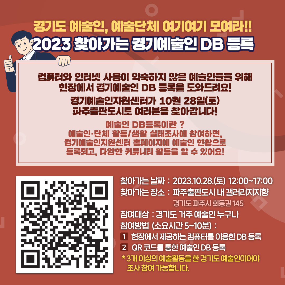 예술인·단체 활동/생활 실태조사에 참여하면 경기예술인지원센터 홈페이지에 예술인 현황이 등록되요!
