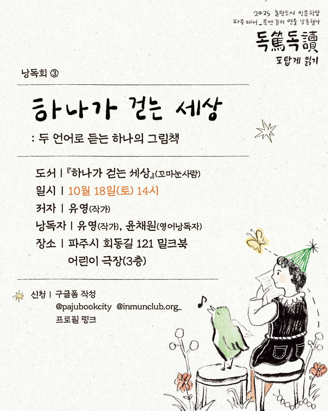 - 낭독도서: 『하나가 걷는 세상』(유영·김다은·트웰브사운즈프로젝트, 꼬마눈사람)