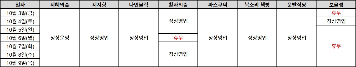 - 추석 연휴기간 위와 같이 운영하오니 이용에 착오 없으시길 바랍니다.